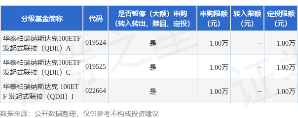 本站消息,10月23日华泰柏瑞基金管理有限公司发布《华泰柏瑞纳斯达克100交易型开放式指数证券投资基金发起式联接基金(QDII)调整大额申购(含定期定额投资)入业务的公告》。公告中提示,为保证本基金的稳定运作,保护基金份额持有人利益,以及根据《华泰柏瑞纳斯达克100交易型开放式指数证券投资基金发起式联接基金(QDII)基金合同》的相关规定,自2025年10月23日起华泰柏瑞纳斯达克100交易型开放式指数证券投资基金发起式联接基金(QDII)调整大额申购(含定期定额投资)入业务,申购上限金额为1.0万元,下属分级基金调整明细如下: